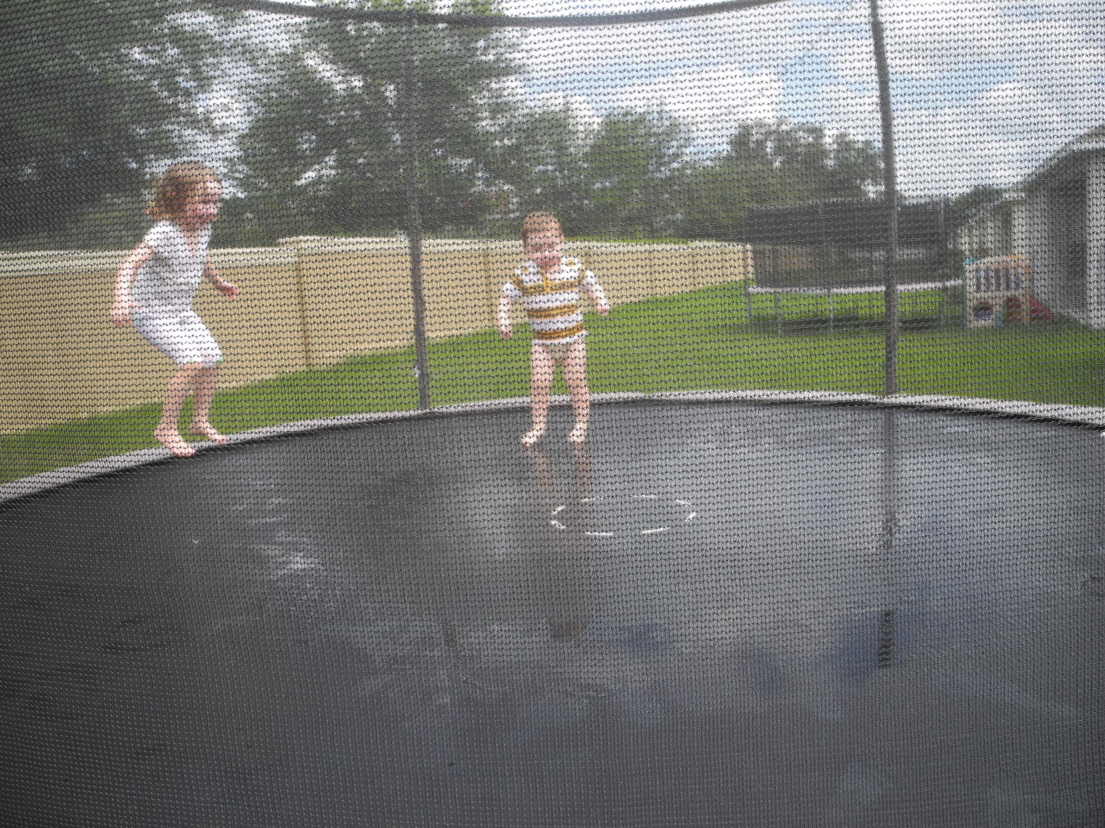 They still had green paint all over, so I needed another approach.  When I was growing up, we used to love putting the sprinkler under the trampoline.  It was just the solution I was looking for.  All the green paint quickly washed away, and the kids were entertained for a very long time.  They absolutely loved it.